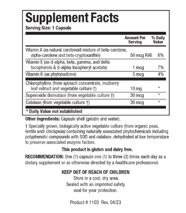 Chlorocaps™ supplies both water and lipid-soluble chlorophyllins, along with lipid soluble vitamins, and SOD and catalase, which function as important antioxidant enzymes. Chlorophyll has been called the "blood" of the plant world, and has the same structure as the heme of blood (except that where the heme carries an iron mineral in the center, the chlorophyll carries magnesium). Thus it may be beneficial in supporting blood quality, and it is a good source of magnesium.*